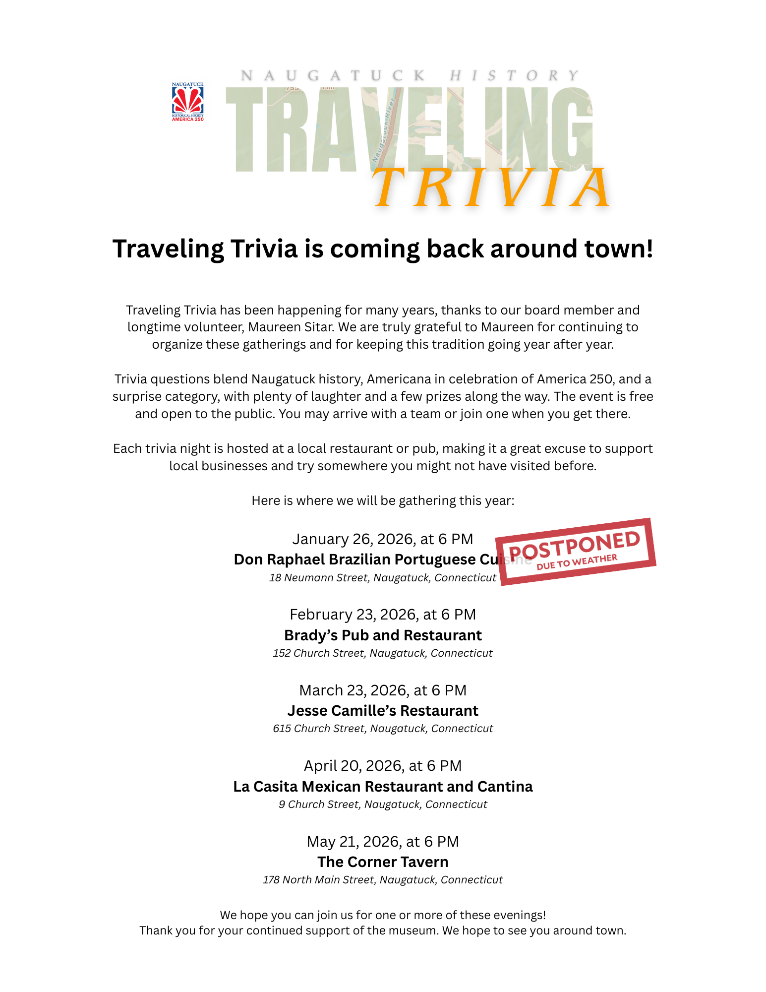 A community trivia series featuring questions on Naugatuck and local history, Americana in honor of America 250, and a surprise theme unique to each location.