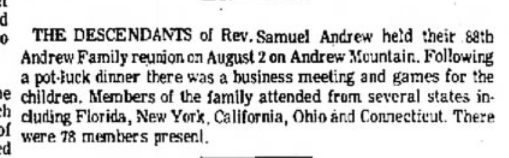 Samuel Andrew purchased the hilltop from the Huntington family. The date of the purchase was 1839. Mr. Andrew renamed the hilltop, Andrew Mountain. The name is retained to this day.