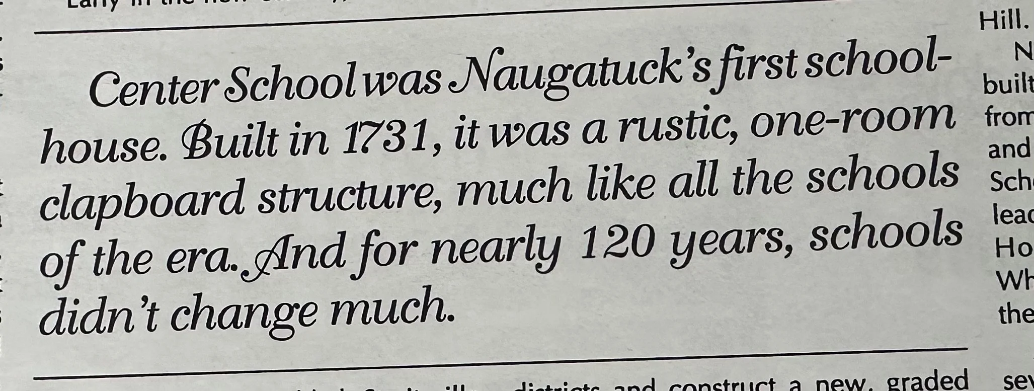 Center School was Naugatuck’s first schoolhouse. Built in 1731, it was a rustic, one-room clapboard structure, much like all the schools of the era. But for nearly 120 years more, the schools didn’t change much, except for the wood stoves that replaced the open fireplaces.