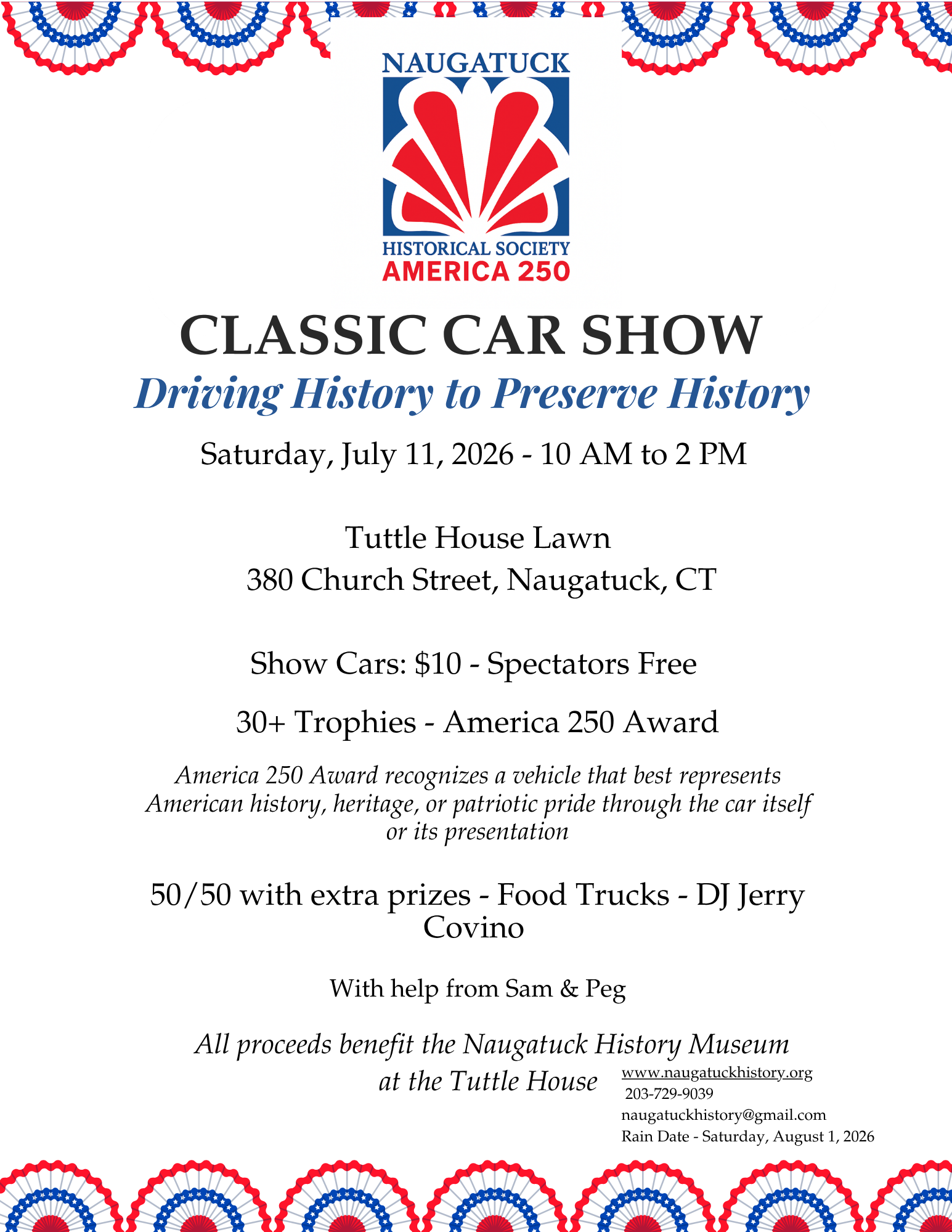 Join us for the Naugatuck History Museum’s Classic Car Show on Saturday, July 11, 2026, from 10 AM to 2 PM on the Tuttle House Lawn, 380 Church Street in Naugatuck.