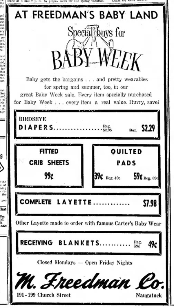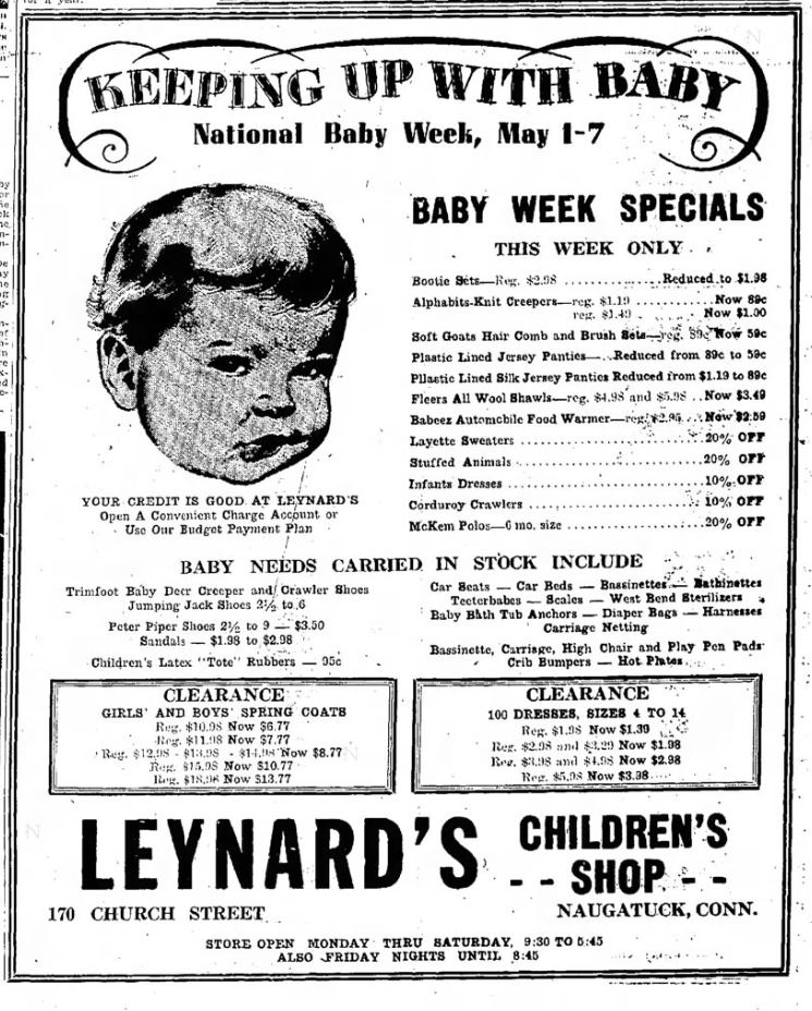 National Baby Week Naugatuck Daily News - Mon, Apr 29, 1957 Naugatuck Daily News - Thu, Apr 23, 1953 Naugatuck Daily News - Thu, Apr 23, 1953 Naugatuck Daily News - Thu, May 05, 1949 Naugatuck Daily News - Thu, Apr 24, 1958 Naugatuck Daily News - Thu, May 03, 1951 Online Research Library