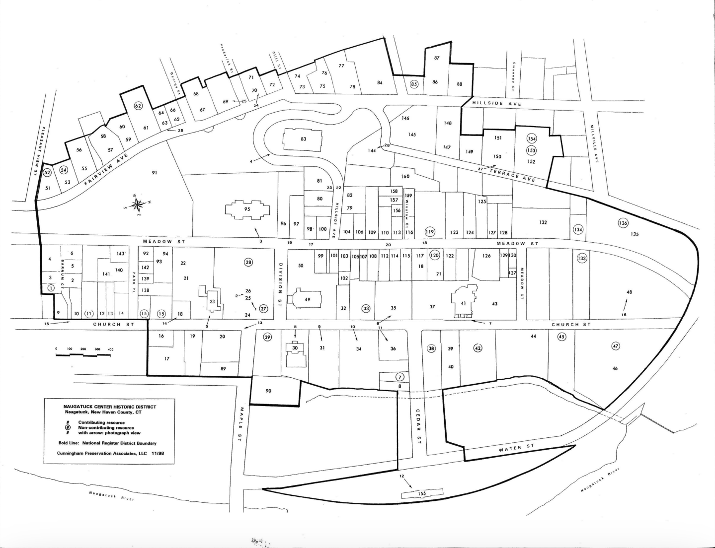 Within the district, three notable sites include the Naugatuck Green and its associated monuments. The area also contains 160 structures, with 137 (86%) recognized as contributing to the district’s historical significance. The 23 non-contributing structures were primarily built after 1948. Key contributing buildings include 30 institutional and commercial structures—such as five churches, three schools, two banks, the town library, firehouse, and railroad station—and 76 historic residences.