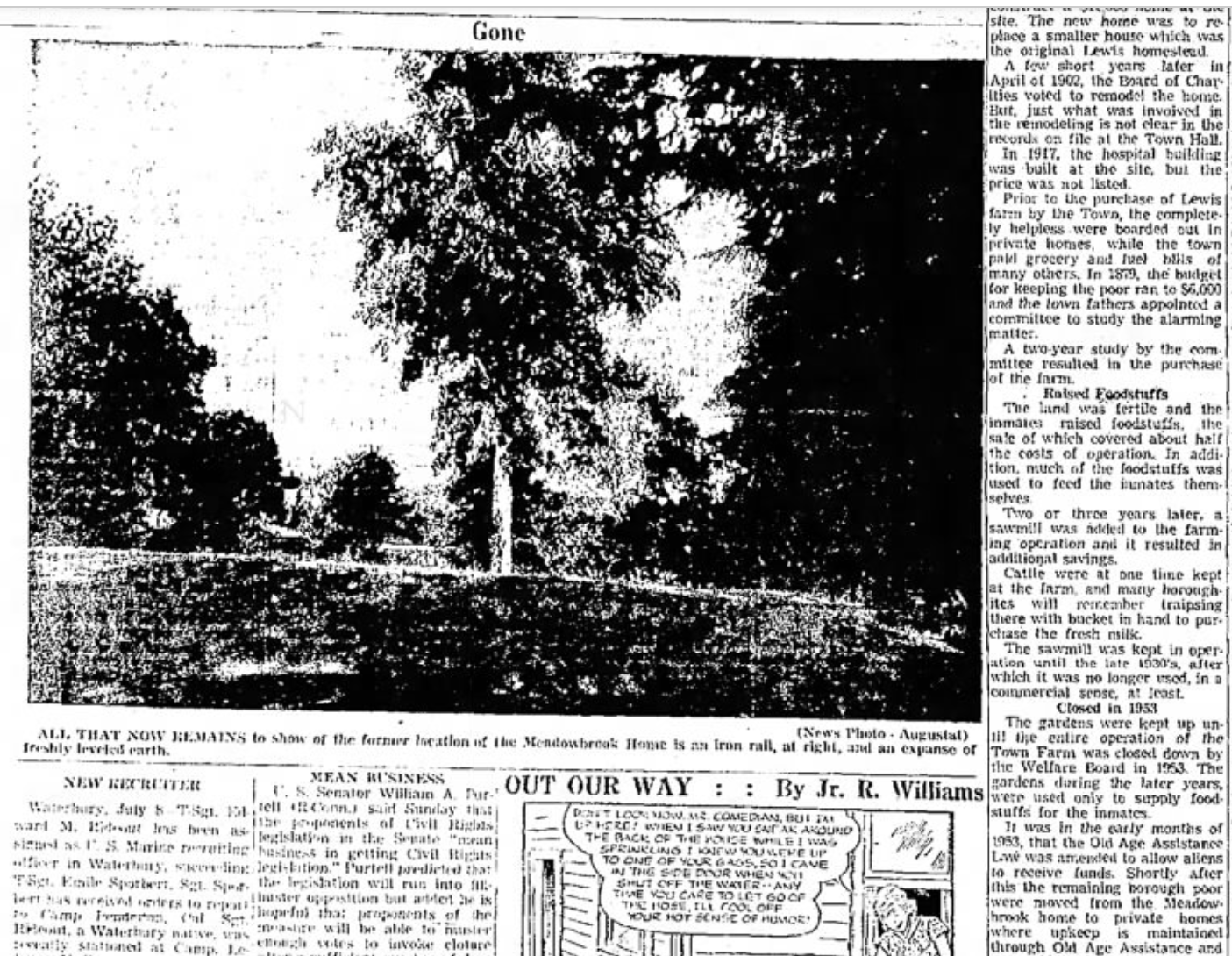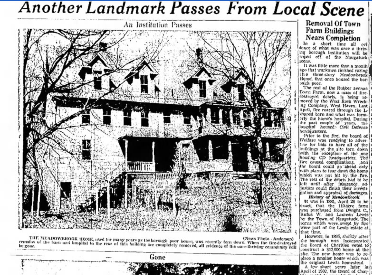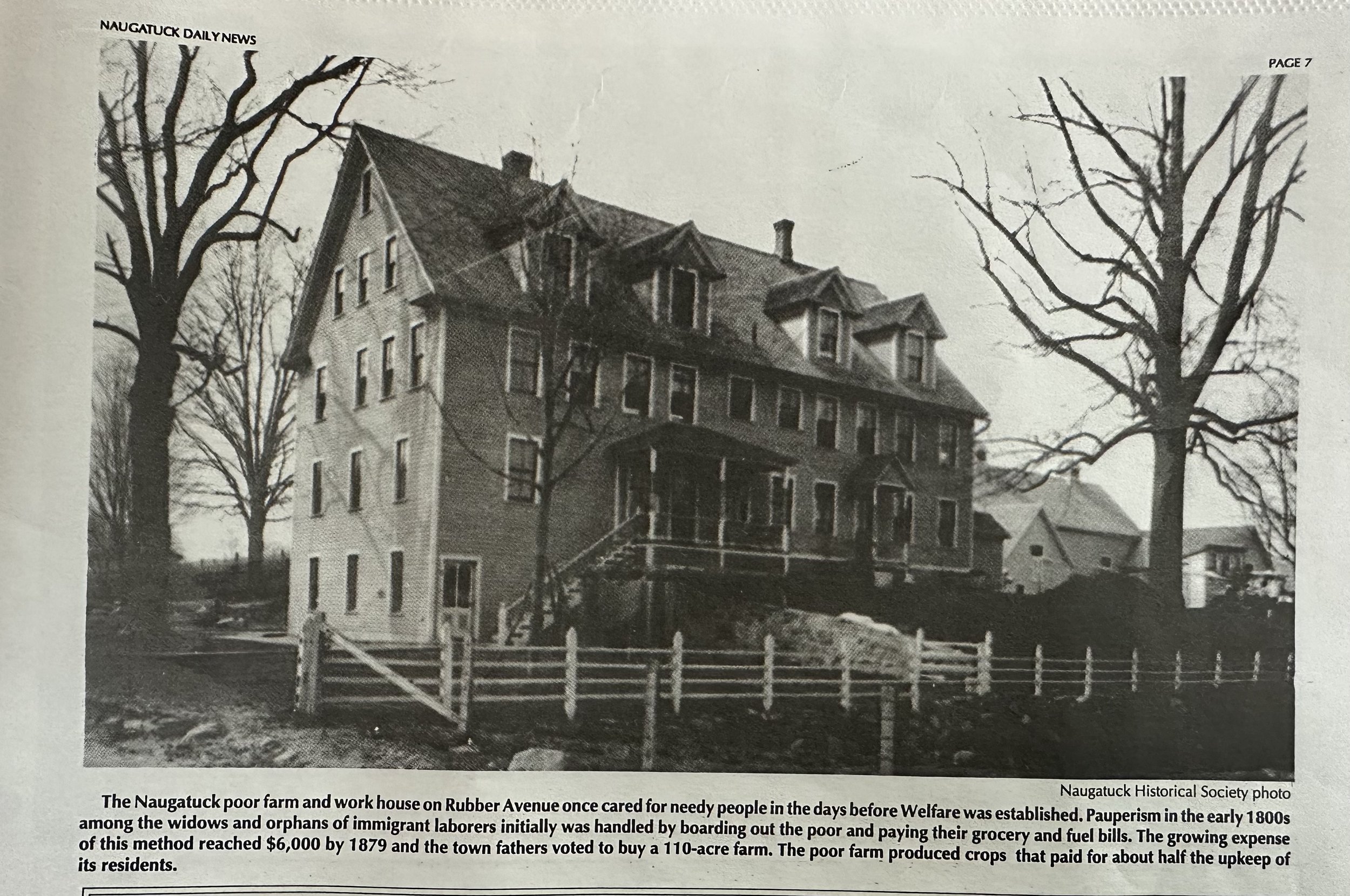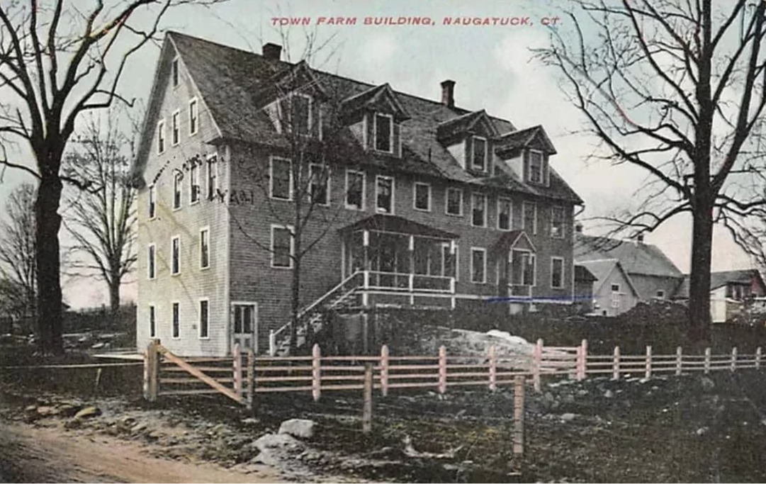 Naugatuck’s Town Farm was established in 1861 on approximately 110 acres along the Millville Road, about one-half mile west of the borough center. The property had previously been the Selden Woodruff farm, and Woodruff Street later took its name from him. When the town purchased the land, a sawmill already stood on the site.