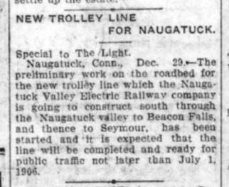 The preliminary work on the roadbed for the new trolley line which the Naugatuck Valley Electric Railway company is going to construct south through the Naugatuck valley to Beacon Falls and thence to Seymour, has been started and it is expected that the line will be completed and ready for public traffic not later than July 1, 1906.